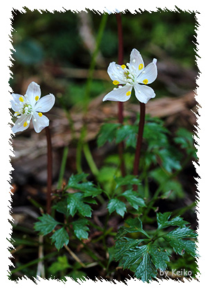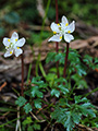 針葉樹林下・林縁。高さ4~15cm。ストロンを出す。根生葉は長柄のある掌状複葉、小葉は5個あり、倒卵形で光沢がありやや厚い。小葉は3中裂し、基部はくさび形で葉柄はほとんど無く、縁には鋭い鋸歯がある。褐色を帯びた花茎を出し1個の花を上向きにつける。花の直径1.2~1.8cm、。白い花弁にみえるのは萼片で5個あり、倒卵形。花弁は蜜を分泌し、黄色で舷部は浅いさじ状。花柱は直立か緩やかに反曲。果実は舟状の袋果で矢車状に開出し、袋果の長さ6~9mm、袋果の柄の長さは約5mm。 |