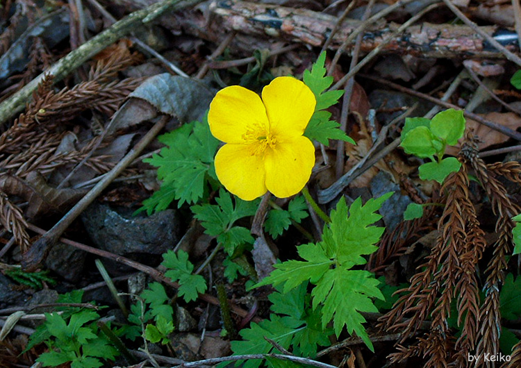 山野の林内。根出葉は奇数羽状複葉で長い葉柄がある。小葉は5~7個で、長さ1.5~5cm、幅1.2~3cmの広卵形または楕円形になり、先端はとがり、縁は切れ込みと細かい鋸歯がある。茎は高さ30~40cmになり、茎の上部に少数の茎葉がつき、小葉の数は1~5個、ふつう3個つく。上部の葉腋に長さ4~6cmの花柄をもつ黄色い花を1~2個つける。緑色の萼片は長さ15~17mmで2個あり、開花直前に落ちる。花弁は4枚で長さ2~2.5cm。雄蕊は多数。花柱は短く、柱頭は2裂する。果実は蒴果で、径3mm、長さ3~5cmの線形になり、やや多数の種子が入る。和名は花の色がヤマブキに似ることによる。上部の葉が深く羽状に裂け、裂片にさらに深い切れ込みのある品種をセリバヤマブキソウという。 |