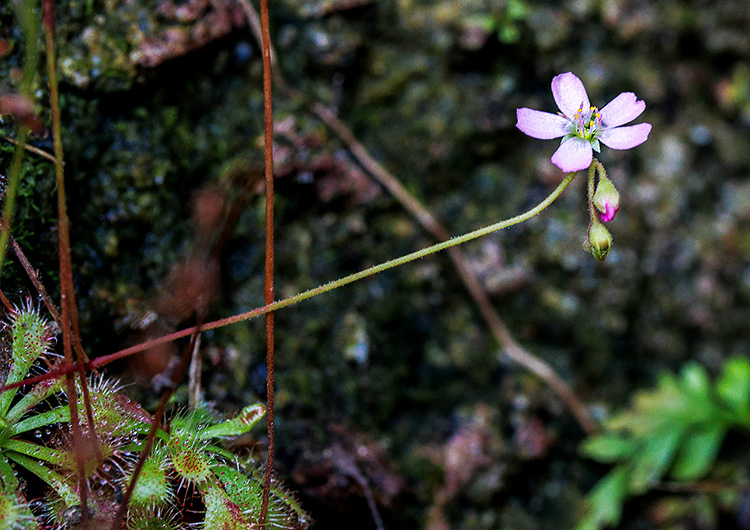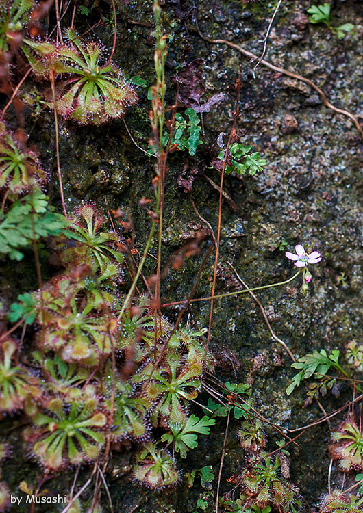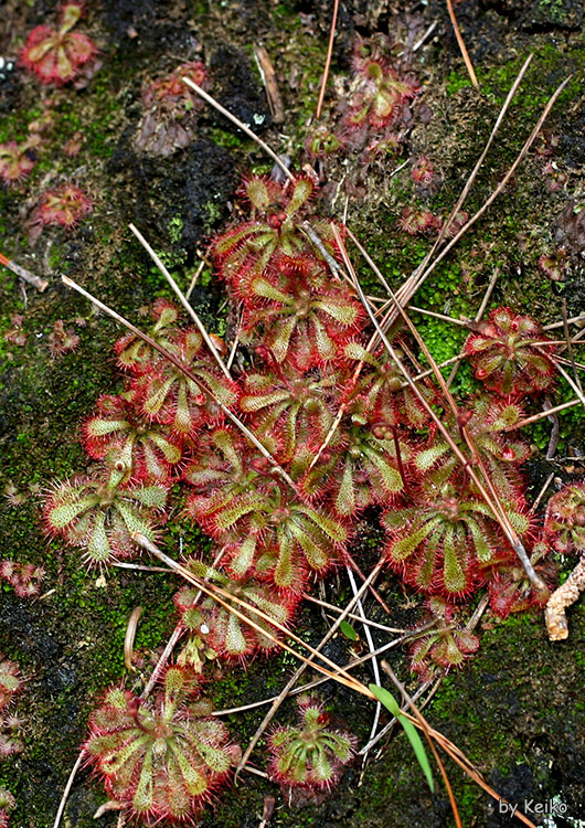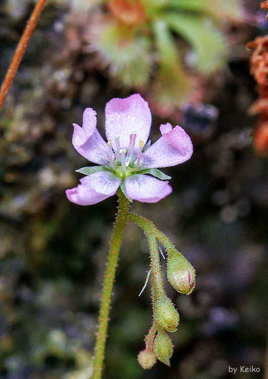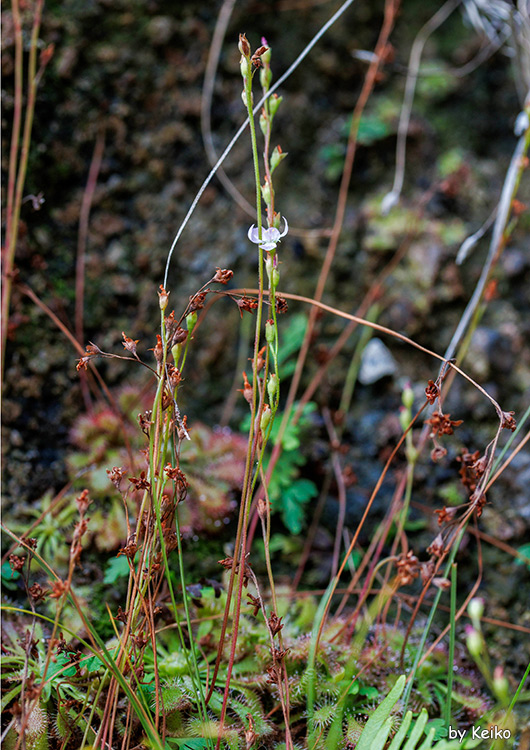 ![]() 2025-08-19 10:05 長崎県 異常な暑さのためか、日差しが強い岩場では葉は枯れ、日陰の岩場のみ辛うじて花を咲かせていました。 花期終盤のようです。5月に見たときよりも葉や花茎の色が緑っぽくなっています。 花期のピークを過ぎると腺毛の赤味が弱まるのかな。 午前10時を過ぎたばかりなのに、もう閉じようとしています。 ![]() 2025-08-19 10:27 長崎県 ![]() 2025-08-19 10:35 長崎県 ![]() 2025-08-19 10:06 長崎県 ![]() 2025-05-28 12:17 長崎県 10cmくらいの花柄を上げ、花序の先はわらび巻き状(さそり形花序)ですが、 花は上向きに咲きます。 残念ながら、花はほとんど閉じていました。 次回は満面の笑みを見せてくれますように。 ![]() 2025-05-28 12:17 長崎県 ![]() 2025-05-28 12:18 長崎県 ![]() 2025-05-28 12:07 長崎県 花は全開すると直径1cmほど、 花茎、花柄、萼も腺毛が密生しています。 ![]() 福岡県 長崎県 ![]() 2008-06-29 11:30 撮影 宮崎県 お昼前なのに、もう閉じ始めています。遅かったようです。 全開している花に会える確率は低いようです。 「野山の花たち」さんの観察によると、 晴れているからといって、咲くとは限らず、何かのきっかけで一斉に開くそうで、 開花が見れれないこともしばしばだそうです。 ![]() 2008-06-29 11:34 撮影 宮崎県 少しですが、コモウセンゴケの花が見え隠れ。 やや眠たげで、全開していないのが残念です。 根元に下の画像のようなロゼット状の葉があります。 ![]() ’04.4.3撮影 奄美大島 |