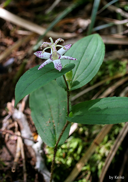 | 山地の林下。草丈30~60cm。茎には斜め下向きの毛があり、葉は卵状長楕円形~狭長楕円形で、長さ8~18cm、まばらに毛がある。花は茎頂と葉腋に1~2個つき、上向きに咲く。花被片は白色で紅紫色の斑点が少なく、上半部は平開するも反り返らない。花柱に紫斑はなく、花柄には毛が多い。 よく似たセトウチホトトギスは、やや毛深く、花披片の下部に黄色の斑点があり、花や花糸に紫斑がある。