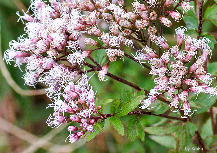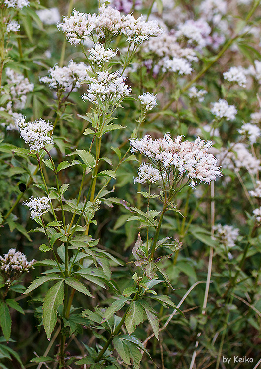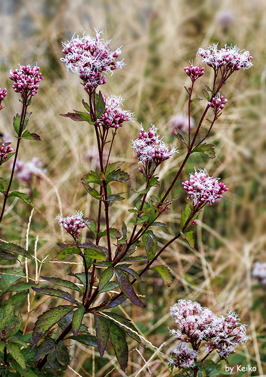 ![]() ![]() 岬の公園にアサギマダラため?のフジバカマが植栽されていました。 茎が赤いものと緑のものが植栽されていました。 茎が赤いものはサワフジバカマ(フジバカマとサワヒヨドリの交雑種)ではないかと思われます。 サワヒヨドリに似ていますが、サワフジバカマの葉は3深裂し、短い葉柄があります。 ![]() ![]() ![]() 図鑑の花期は8~9月ですが、九州北部、山口県では10月頃が花盛り。 撮影したのは11月始めですが、ややピークをすぎたくらいで、 10数頭のアサギマダラがひらひら舞い飛び、花から花へと吸蜜にしていました。 アサギマダラの雄は性フェロモン分泌のために フジバカマなどの蜜に含まれるピロリジジンアルカロイドの摂取が必要らしい。 ’25.11.4撮影 下関市(山口県) |