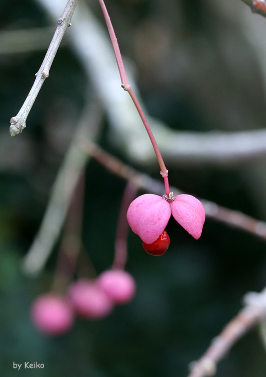 アンドンマユミ:落葉低木、枝に黒褐色のこぶ。4数性、1花序に1~5個、蒴果は4裂、紅紫色に熟す。