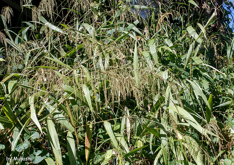 よく似たコササキビは葉の幅が3cm内外と狭く、全体に小ぶりで穂は垂れ下がらない。 |