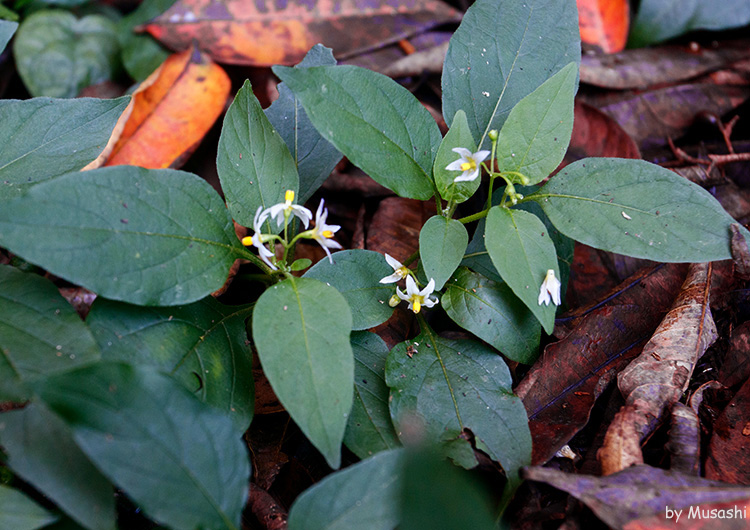 イヌホオズキ:葉はやや厚く波状鋸歯縁。花は白色で、やや総状に付く。光沢のない黒い液果。 |