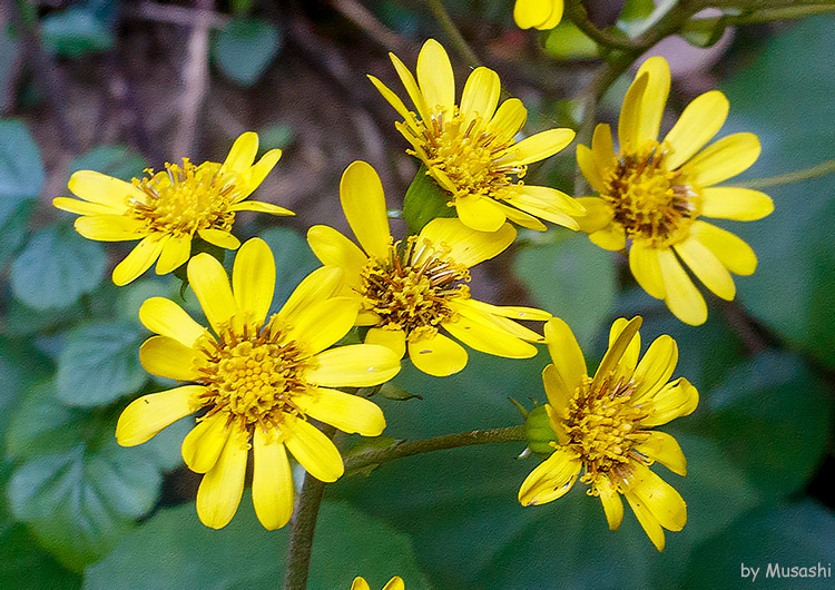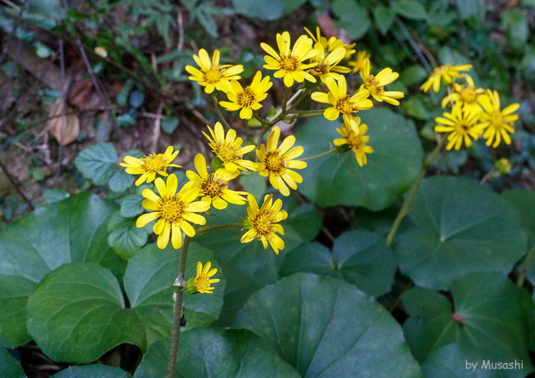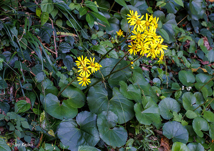![]() ’25.11.15撮影 天草市(熊本県) 11月になるとキク科の季節、ツワブキの黄色が目立ちます。 葉柄は食用になりアク抜きをして佃煮風にしたものが「キャラブキ」です。 ちなみにツワブキの葉柄は穴がなく、フキには穴があります。 ![]() ’25.11.15撮影 天草市(熊本県) ![]() ’25.11.15撮影 天草市(熊本県) 花はまわりにには雌性の舌状花が1列に並び、 中心部に両性の筒状花(管状花)が多数集まっています。 ![]() ’02.11.4撮影 田平町(長崎県) ![]() ’11.12.23撮影 志賀島(福岡県) 草刈りのあと伸びてきたツワブキです。 コンパクトながら、鮮やかに花を咲かせていました。
