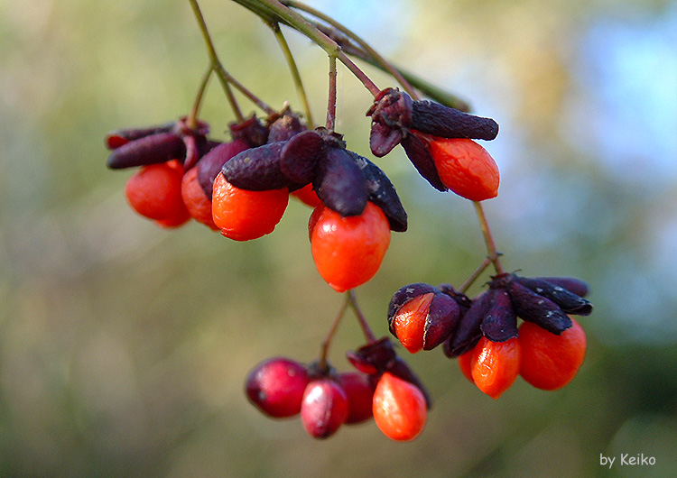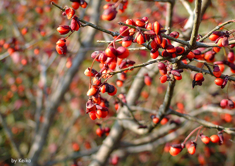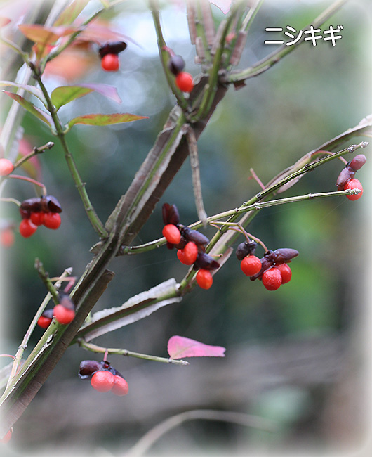 高さ1~3m。枝は下部から枝分れして緑色、コルク質の褐色で薄い4枚の翼がある。葉は対生し、葉身は倒卵形~長楕円形で長さ2~9cm、幅1~4.5cm。先は鋭頭~急鋭尖頭、基部は普通くさび形、両面無毛で縁には鋭い細鋸歯がある。葉柄は長さ1~3mm。花は側枝または葉腋や葉腋痕から集散花序を出して1~7個つき、黄緑色で径6~8mm。花弁は4個、広楕円形で縁に不揃いの鋸歯がある。雄しべは4個、雌しべは1個。果実(蒴果)は1~2個の分果に分れ、分果は長さ5~8mmの楕円形で熟すと裂開し、橙赤色の仮種皮に包まれた種子が顔を出す。枝に翼ができないものをコマユミという。 |
