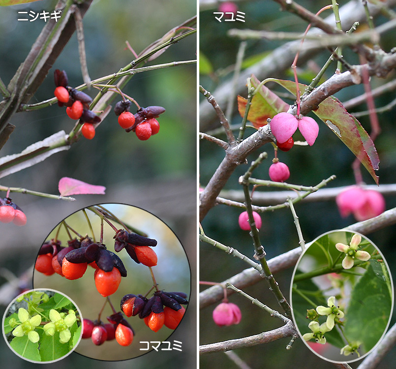 ニシキギの品種でコルク質の翼がないもの。高さ3m程度。葉は対生し、長さ10cm程度の倒卵形。花は4花弁で雄しべ4コ。秋に紅葉し美しい。葉の幅、長さともに大きいものをオオコマユミという。 |
