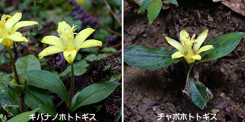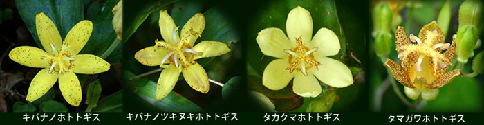 東海、近畿地方、四国、九州南部。キバナノホトトギスに似るが、小さい。茎の高さ2~15cm。葉に紫褐色の斑紋がある。花柄は0.5-1.5cm。花は黄色、一日で終わる。 |