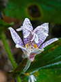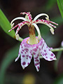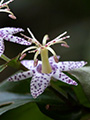 紀伊半島南部に自生。ジョウロウホトトギスに似るが、葉が細くて光沢があるところで判別できる。花は下向きに開く。葉の基部は深心形で、両側に耳片があって茎を抱く。 |