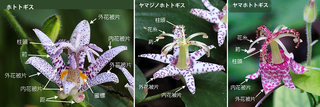 近畿から中国・四国地方に分布。ヤマジノホトトギスに似るが、花被片の下部に黄色の斑点がある。花糸に紫色の斑点がある。 |