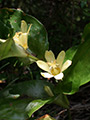 宮崎県に自生し、山の崖に下垂する。無毛。葉の基部は茎が突き抜く形になる。 花は黄色で葉腋に1個ずつつき、上に開く。 |
