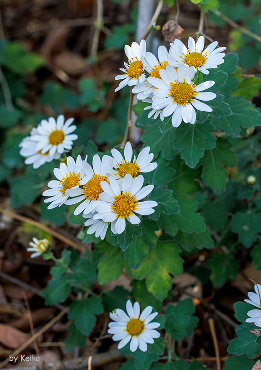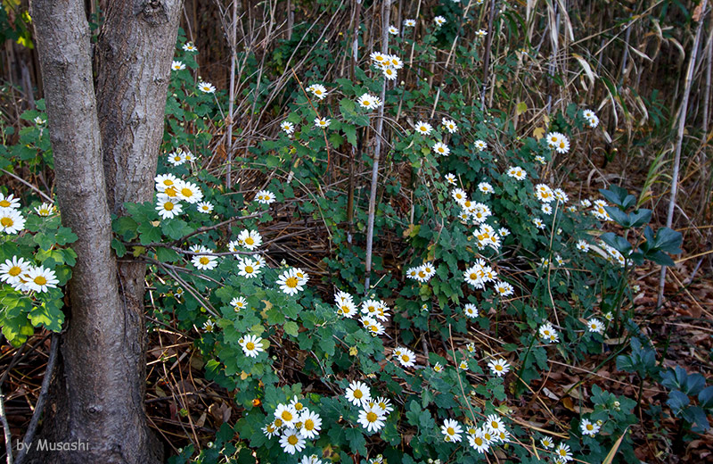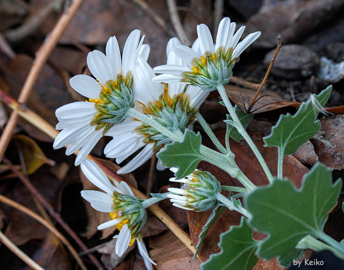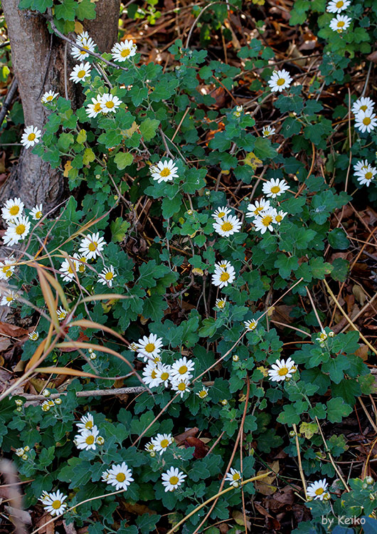 ![]() ’25.12.10撮影 福岡市東区 4年ぶりに行ってみました。 今年も河原の一角だけに群生し、見頃を迎えていました。 花の直径は大きいものは4cm程度、小さいものは2.5cm程度。舌状花は1.2~1.8cm。 花のサイズはサンインギク(シマカンギクとイエギクの交雑)なんですが、 ↓茎、総苞はノジギクに見えるのです。 九州のノジギクの分布は東岸から大隅半島、薩摩半島南端まで。 とっても美しく、愛らしいのに、、、今年もやっぱり不明です。 ![]() ’25.12.10撮影 福岡市東区 ![]() ’25.12.10撮影 福岡市東区 ![]() ’25.12.10撮影 福岡市東区 ![]() Aは遠賀郡芦屋町の海岸沿いで撮影したサンインギクかシロバナハマカンギクと思われるもの。 Bは東区松崎町の河原で撮影したもの。 Aは舌状花が極僅かに黃みを帯び、長さ1~1.2cm、花の直径2.2~2.7cm。 Bは舌状花が純白で、長さ1.2~1.8cm、直径2.5~4cm。 どちらもサンインギクかもしれませんが、素人には判断できません。 ![]() ’21.11.25撮影 福岡市東区 ’18年に撮影した辺りは蕾だったのですが、少し奥を見ると開花していました。 こちらの個体は葉の切れ込みが単純で丸っぽく、アシズリノジギクに似ています。 ノジギクやアシズリノジギクの分布域ではないので、イエギクかサンインギクと考えるのが妥当なんでしょうね。 ![]() ’21.11.25撮影 福岡市東区 花の大きさは大小(3.5~5cm)ありますが、シマカンギクより大きいです。 ↓中間サイズの花を500円硬貨(直径2、65cm)と比べってみました。 ![]() ’21.11.25撮影 福岡市東区 ![]() ’18.11.24撮影 福岡市東区 ![]() ’18.11.24撮影 福岡市東区 ![]() ’18.11.24撮影 福岡市東区 10年前と変わらず、大らかに咲き誇っています。 花の大きさは4~5cm、全体に大柄でシマカンギクよりパワフルな感じ、 50mくらい離れたところに咲いていたシマカンギクがやけに小さく華奢に感じました。 シマカンギクを片親とするサンインギクなのかしら? サンインギクではなく、イエギクの野生化したものかしら? この白い菊は見るたびに、悩みそう。 DNAで判明するものなら、どなたか答えを出してください。 ![]() ’07.12.3撮影 福岡市東区 ![]() ’07.12.3撮影 福岡市東区 ![]() ’07.12.3撮影 福岡市東区 ![]() ’18.11.24撮影 福岡市東区 鳥見で通っている河原に11月中旬から白い野菊が咲き始めます。 大きさはノジギクくらいですが、日本海側に分布するとは考えられないし、周辺を見回すと黄花も少しだけ咲いていました。 調べた結果、考えられるのはサンインギク。 シマカンギクの変種から、最近になって、シマカンギクとイエギクの雑種で独立種になっています。 すぐ近くにウラギクやフクドも咲きますが、大潮の満潮時にも水没しない土手側に群生しています。 黄花を撮影していないので、1年待ったのですが、護岸工事前の草刈りで見つけることが出来ませんでした。 |