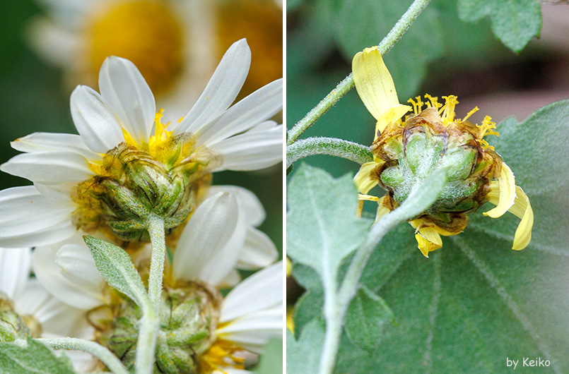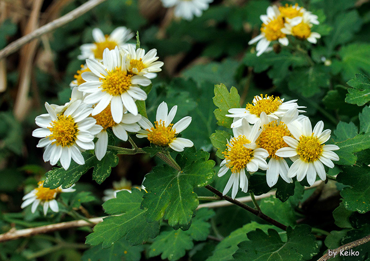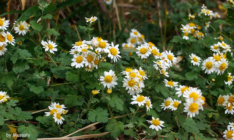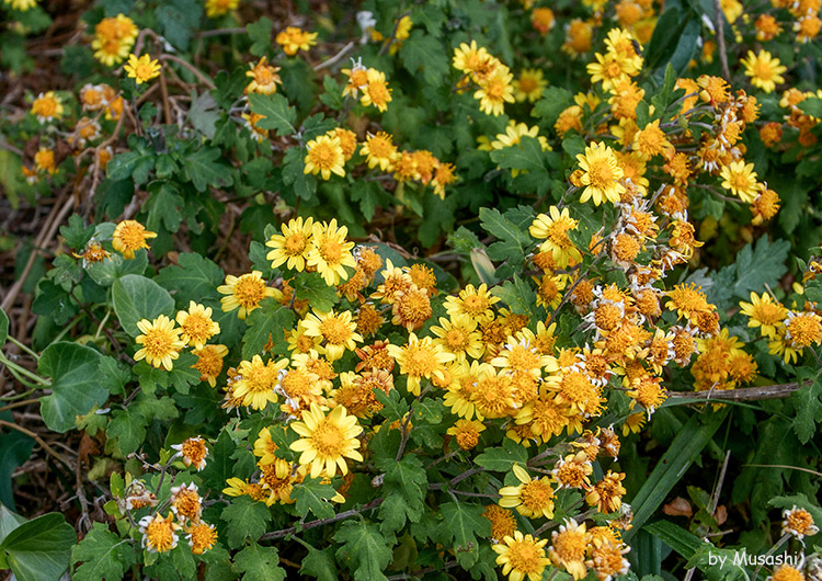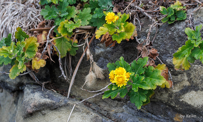 ![]() 海岸沿いの一箇所だけに舌状花が白いキクが咲いていました。 サンインギク(シロバナハマカンギク)でしょうか。 花の直径は花の直径2.2~2.7cm。 東区の白花個体(直径2.5~4cm)より小さいです。 舌状花は極わずかに黄みを帯びた白色~白色で、葉は典型的なシマカンギクよりやや丸っぽい感じ。 ![]() ↓同じ海岸の遊歩道を進むと、今度は黄色花の小群落。 シマカンギク? サンインギク? 花はピークを過ぎていますが、花は鮮やかな黄金色をしていて、直径2~3cm程度。 ![]() ![]() ↑岩場の個体は黄色花で直径2.5cm程ですが、葉に違和感が、、、。 ↓更に進むと、レモンイエローの個体も現れました。手前の個体は直径2cm,後ろの個体は3.5cm ![]() ↓白色タイプと黄色タイプの総苞を撮影しましたが、少し違うような。 ![]() サンインギクはシマカンギクの6倍体とイエギクとの自然雑種なので、 シマカンギクの6倍体が見られる地域では各地で見られるそうです。 シマカンギクの4倍体は九州南部、中国地方~近畿地方。 シマカンギクの6倍体は九州北部~中国地方西部、中国·近畿地方~北陸地方(富山県)のところどころ。 変化が多すぎて、素人には判断が難しく、お手上げです。 ’25.12.11撮影 遠賀郡芦屋町(福岡県) |