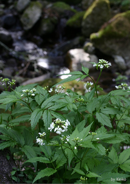 山地谷沿いの湿地。高さ30~50cm。葉は長柄があり、葉柄の基部は耳状にならない。葉身は奇数羽状複葉、小葉は5~7個、長楕円状披針形、先端は鋭突頭、縁は不規則な先のとがった鋸歯があり、基部はくさび形になる。茎上部に短い総状花序をつけ白色で直径7~10mmの4弁花を多数つける。果実は長角果で線形。和名の由来は不明。 |