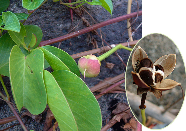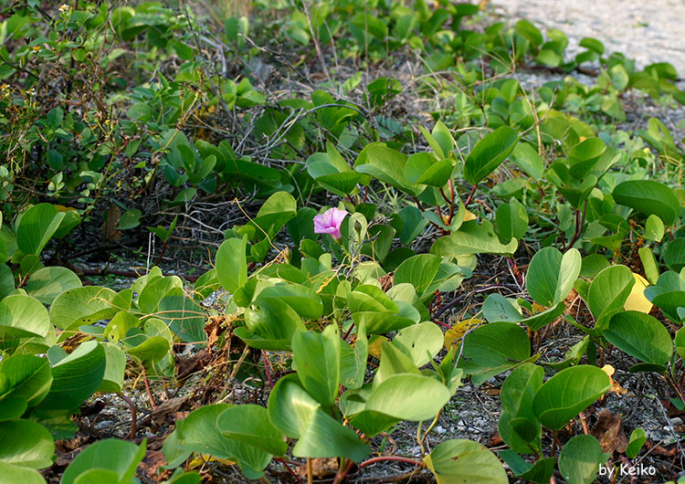 暖地の海岸の砂地 和名は葉が軍配に似ていることによる。葉は互生し、長さ3~8cm、先端はへこみ、左右から2つ折りに重なる感じになる。葉腋から長い花柄をだし、紅紫色の花を1~5個つける。花冠は直径4~6cmの漏斗形。 実はさや状で中に種があり、乾くと裂開する。種子は海水に浮き、海流に乗って分布を広げる。