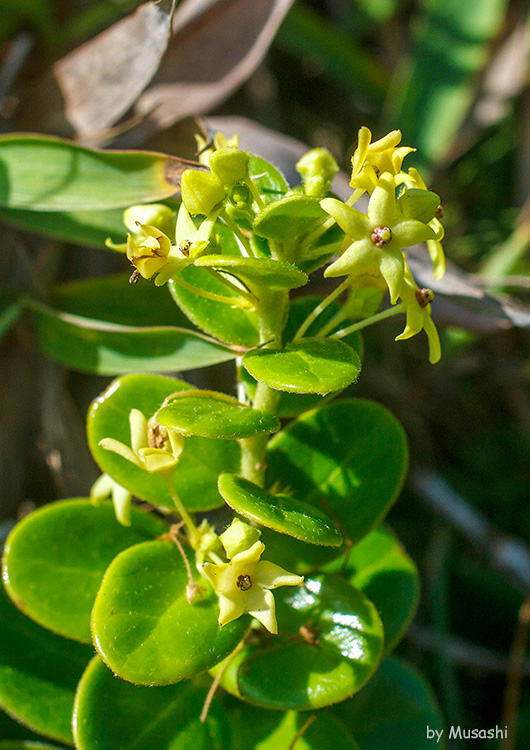 海岸近くの草地。草丈10~40cm。茎は直立し、全体に密に毛がある。葉は対生、楕円形~卵形で長さ1.5~4cm、幅1~3.5cm。先は微凸頭、基部は円形で全縁。全体に毛が多く、裏面に著しく脈が浮き出る。葉柄は長さ1.5~2mm。花は上部の葉腋からやや短い花序を出し、数個つく。花序軸はほとんど発達しない。花冠は濃褐紫色~黄褐色で5裂し、裂片は長楕円形、長さ約3.5mm。副花冠は楕円形、内面は無毛、外面は短毛がある。果実(袋果)は広披針形、長さ3.5~4.5cm、密に毛がある。種子は長さ3.5~4.8mm、葉が1.6~2.5mm。