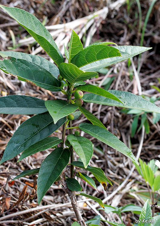 ![]() ’26.1.20撮影 瀬戸内町(奄美大島) この海岸にはホソバムクイヌビワがあるそうなので、 撮影した画像をじっくり見たのですが、葉の基部、果実の形態から普通のイヌビワのようです。 ![]() ’26.1.20撮影 瀬戸内町(奄美大島) ![]() ’21.8.10撮影 新宮町(福岡県) 「イヌビワ」というより「イヌイチジク」って感じですよね。 ビワはバラ科ビワ属で、イヌビワはクワ科イチジク属、道理でビワみたいな花が咲かないんだ。 イチジクは「無花果」と書きますが、花を咲かせずに実をつけるように見えることに由来してます。 イチジクの仲間は花序が袋になっていて、その中に小さな花がたくさん入っているので、見えないんですよね。 上の画像では赤いのが花嚢で手前の黒いのが果嚢だと思います。 (雄花嚢は基部が細長くのびていることが多いそうなので、これは雌花嚢かな。) 花嚢の中には花がぎっしり詰まっています。 イヌビワは花と果実の区別も、雌雄の区別も難しいです。 雌果嚢は食べれますが、雄花嚢は虫えい(イヌビワコバチの巣)になっていることが多いので、ご注意下さい。 < イヌビワとイヌビワコバチは共存関係 > イヌビワコバチ雌は雄花嚢の中に入り、卵を産みます。 花嚢に入るとき翅はとれてしまうので、産卵後、外には飛び立つことはできず、一生を終えます。 雌花嚢に入ってしまった場合は、雌花の花柱が長いため卵を産みつけられず、ウロウロしながら死んでしまうのですが、 その間、体についた花粉を受粉することになります。 花嚢の中の卵は幼虫~蛹と成長し、成虫になると交尾をします。 雄は翅がないので花嚢の中で一生を終え、翅のある雌は花嚢にある花粉をつけて外に飛び立ちます。 花粉を運んでくれるイヌビワコバチ雌のお陰で、雌株に美味しい果実がつくわけです。 因みにイチジクも同様で、受粉はイチジクコバチに頼っているそうです。 美味しい果実は鳥や動物が食べ、種をばらまいてくれます。 ![]() ’21.8.10撮影 新宮町(福岡県) ↓こちらは葉が長いので、ホソバイヌビワまたは雑種だと思います。 ![]() ’21.8.10撮影 新宮町(福岡県) |