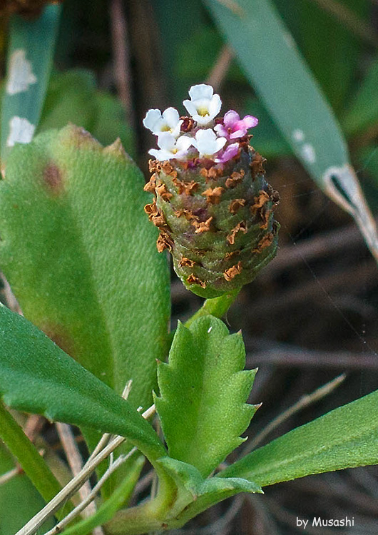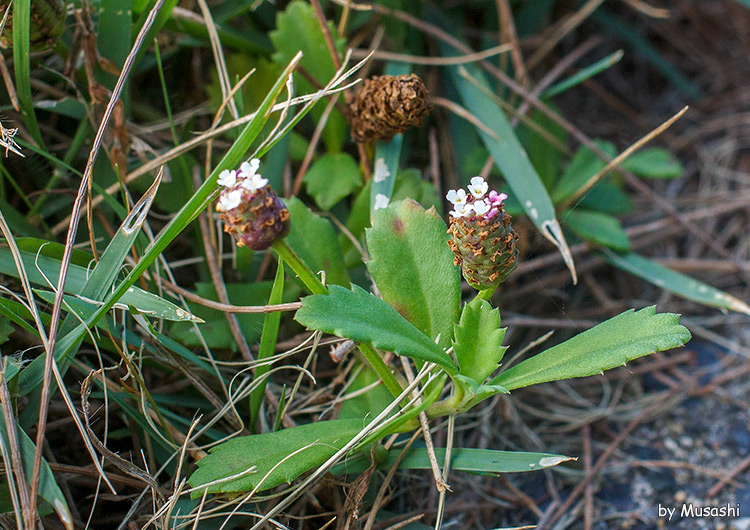 日当たりの良い海岸。茎は長く砂の上をはう。葉は対生、倒卵状楕円形で、上半部に粗い鋸歯がある。葉腋から花茎を出し、円柱状の密な穂状花序をつくる。扇形の苞のわきに直径2mmほどの花を1つずつつける。花冠は5裂し、初めは白色で次第に紅紫色を帯びる。