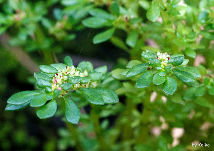 全縁、短柄がある。花は葉腋につき、直径1mm程で緑色~紅緑色、同じ株に雌雄別々につくか、又は別株になる。花被片は4個で、長さは1mmに満たない。