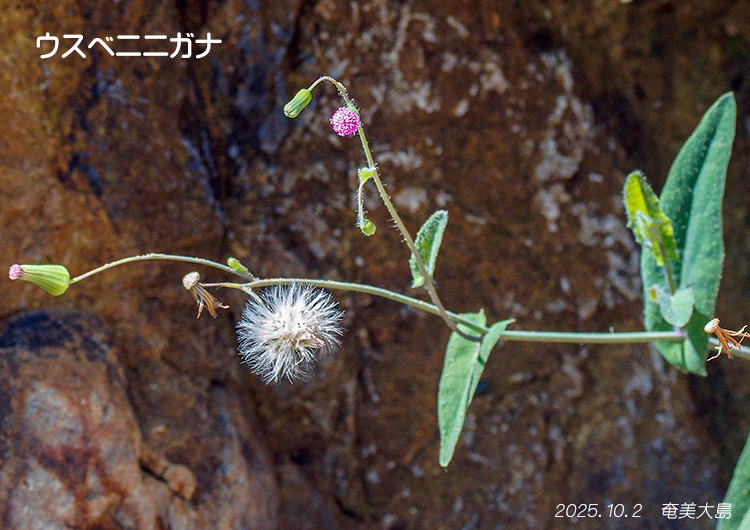 道端、荒地。草丈20~100cm。茎は直立し、上部で分枝するか時に基部で分枝し、灰白色の毛と腺点がある。葉は互生し、茎葉の葉身は菱状卵形~卵形~円形、長さ3.5~6.5cm、幅1.5~3cm。先は鋭頭、基部はくさび形、縁は波状縁または微凸状の鋸歯があり、下面に伏毛と腺点がある。基部~中部の葉には1~2.5cmの葉柄があり、翼がある。頭花は散房状の円錐花序に多数つき、両性の筒状花で長さ7~8mm。花冠は淡紅紫色~藤色、長さ5~6mm、先は5裂する。果実(痩果)は円柱形~やや紡錘形、長さ1.2~3mm、幅約0.7mm。冠毛は白色で2輪生。