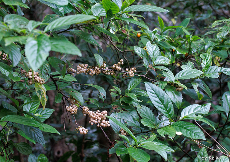 低地~山地のやや湿気のある林内。樹高2~3mの常緑低木。葉は全縁で、互生し、長さ10cm程度の長楕円形。垂れ下がるように花をたくさん付ける。 花冠は白色で広鐘形、長さ約3mm、上部は5中裂し、やや反り返る。果実は球形の初め茶褐色で、のち熟して乳白色になり、多数つく。実は食べられるが、甘酸っぱいだけ。葉の鋸歯がイズセンリョウより細かいのが区別点。 |