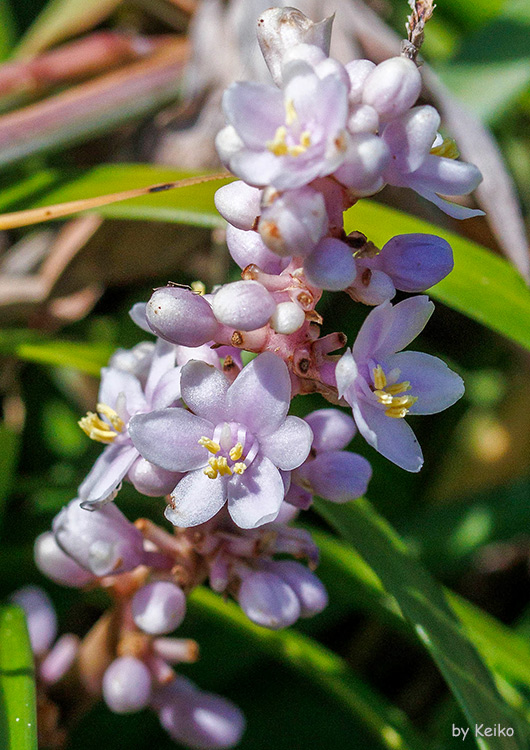 林下に生える多年草。ストロンをもつ。根の端部に楕円状肥厚がときどきある。葉は長さ25~55(~70)cm、幅4~7(~10)mm、鋭頭~鈍頭。花茎は直立、長さ10~40cm、角稜があり、基部は鱗片葉で包まれる。花序は長さ(4ー)8~15cm、側枝の長さは3mmまで、全部で20~200花以上、1つの節には2~9花をつける。苞は卵形、長さ2~6mm、膜質、先は鋭先形~尾状。花柄は長さ3~5mm、紫白色~淡ピンク紫色、上部に関節がある。花被は浅い漏斗形、長さ4~5mm、淡紫色~ピンク紫色、裂片は楕円形、長さ3.5~4.5mm。花糸と葯はともに長さ約2mm。成熟種子は球形、径5~7mm、光沢のある黒紫色。 |