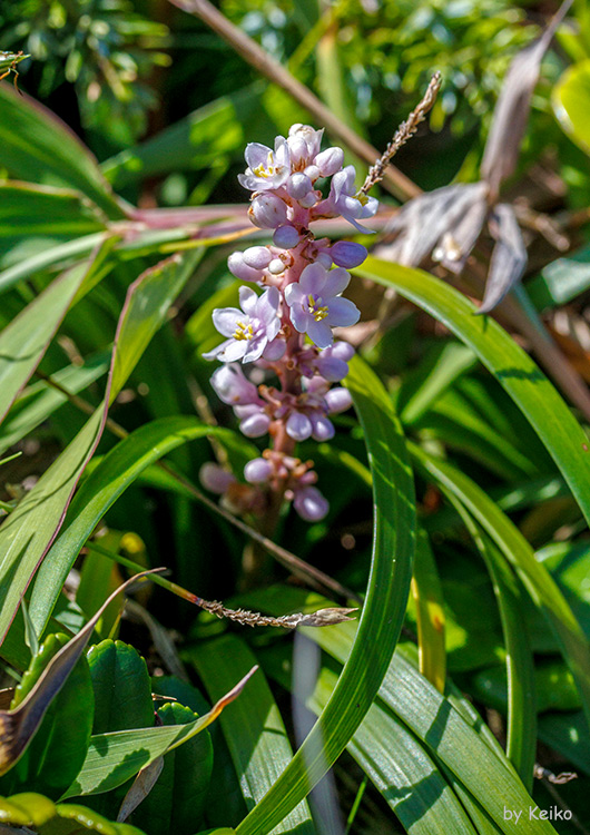 と細長くて、7~11本の葉脈があり、先は垂れる。株の葉の間から多数の花茎が立ち上がり、高さは30~50cmになり、花茎上に長さ8~12cmの穂状花序を形成して、多数の淡紫色の小さな花を密につけて咲かせる。花の花被片は楕円形で6枚、雄しべは6本、雌しべは1本。花柱の先端は裂けていない。秋、直径5