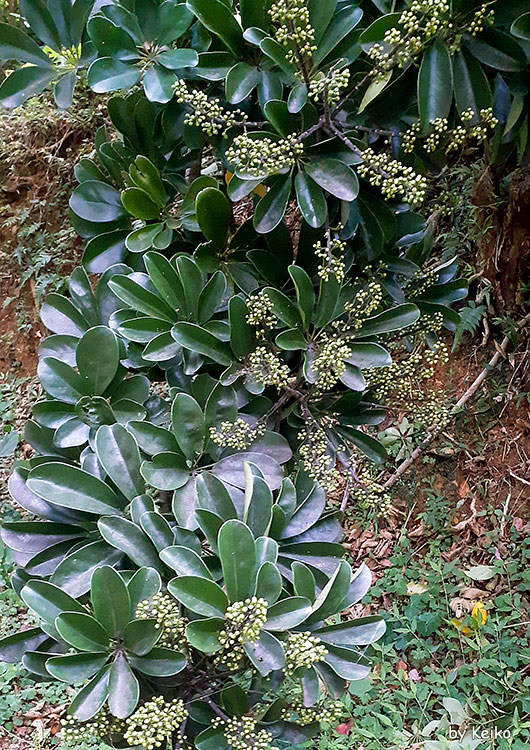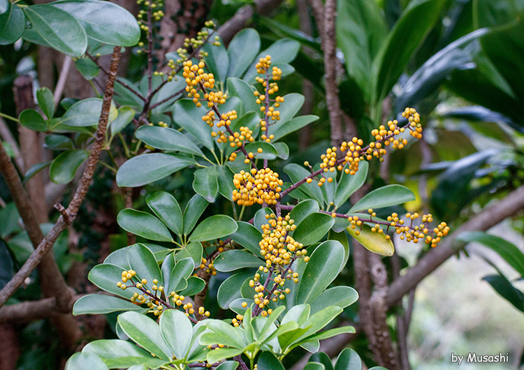 ![]() ’26.1.20撮影 龍郷町(奄美大島) 道端に植栽?された実だくさんの木に惹きつけられてパチリ。 はじめ見たのは淡緑色の実だったのですが、数メーター先は真っ黄色の実、何だろう? Googleレンズさんに聞いてみると、ホンコンカポックというお答えが! 葉は観葉植物のカポックに似ているけれど、、、 更にGoogleで検索すると、カポックはパンヤ科(アオイ科)で標準和名が「パンヤノキ」と全く別の植物、 ホンコンカポックやカポック(シェフレラ)として売られている観葉植物はウコギ科のヤドリフカノキ。 沖縄や南西諸島には原種のフカノキが自生しているらしい。 フカノキは葉柄が長く、葉が大きく、細長い、熟した果実は黒褐色。 ヤドリフカノキは葉に厚みがあり、丸みを帯びている、熟した果実は黄色~赤紫色。 ということで、ヤドリフカノキのようです。 ![]() スマホ撮影 ’26.1.20撮影 龍郷町(奄美大島) 海岸沿いの道端でも元気に育っていました。 |