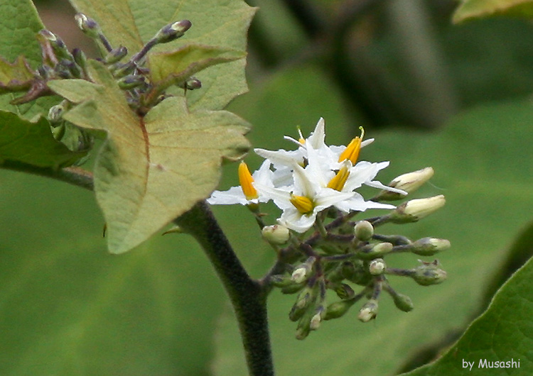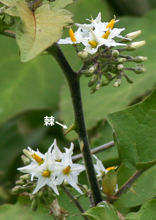高さ1~2mになる常緑低木。茎には長さ4~6mmの下部が扁平になるとげが散生する。若枝には星状毛が密生する。葉身は広楕円形または卵状楕円形で先はとがり、長さ8~25cm、幅6~20cm、縁に2~3個の大きな歯牙があり、両面に星状毛が密生し、裏面は灰白色をおび、基部は左右不整で急に狭くなり、葉柄との境は明瞭。葉柄は長さ2~10cm、星状毛が密生する。基の途中から長さ3~5cmの散房状の集散花序を伸ばし、多数の花をつける。花柄は花時に長さ5~10mm、果時に太くなり、長さ10~20mm、はじめ腺毛が密生し星状毛を混じえるが、のち腺毛はなくなる。萼は鐘形で長さ約3mm、裂片は広卵形で先はとがる。花冠は白色、皿形で径2cm、外面に星状毛を密布して5裂し、裂片は広披針形で先がとがり、長さ約1cm。葯は長さ約7mm。液果は球形で径15~18mm、黄熟する。種子は扁平で径約2mm。西インド諸島原産で世界の熱帯に広く帰化。琉球に帰化し、沖縄島に多い。 |