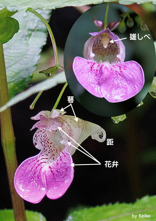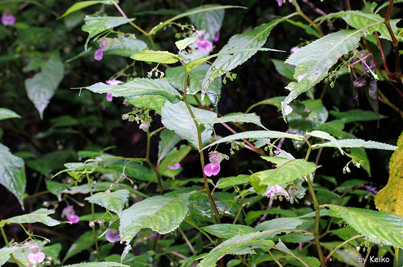 ![]() ’25.9.12撮影 阿蘇市(熊本県) 雨上がりのハガクレツリフネは一段と綺麗です。 ![]() ’25.9.12撮影 阿蘇市(熊本県) 花は構造が分かりづらいですが、 萼は上に見えるもの2個と、後ろに伸びラッパ状のもの1個、合計3個。 花弁は上に1個、左右に2個ずつ(左右1個ずつに見えますが合着した小さい花弁があり)、合計5個あります。 筒状の萼の中心に見えるのは雄しべ。 雌しべの花柱は雄しべに包まれています。 雄しべは花粉を出し終わる頃に外れて、雌しべが現れる仕組みになっています。 ![]() ’13.9.24撮影 ![]() ’13.9.24撮影 大雨災害の復旧工事が終わり、様変わりしました。 流された野草も多いのに、ハガクレツリフネはたくましいです。 ![]() ’06.9.3撮影 ![]() ’06.9.3撮影 ![]() ’06.9.3撮影 九州自然歩道はくねくねと長く、ブヨや蚊たちの多さは半端ではありません。 しかし、両側に続くハガクレツリフネの群生で少しは気が紛れました。 阿蘇外輪(熊本県) |