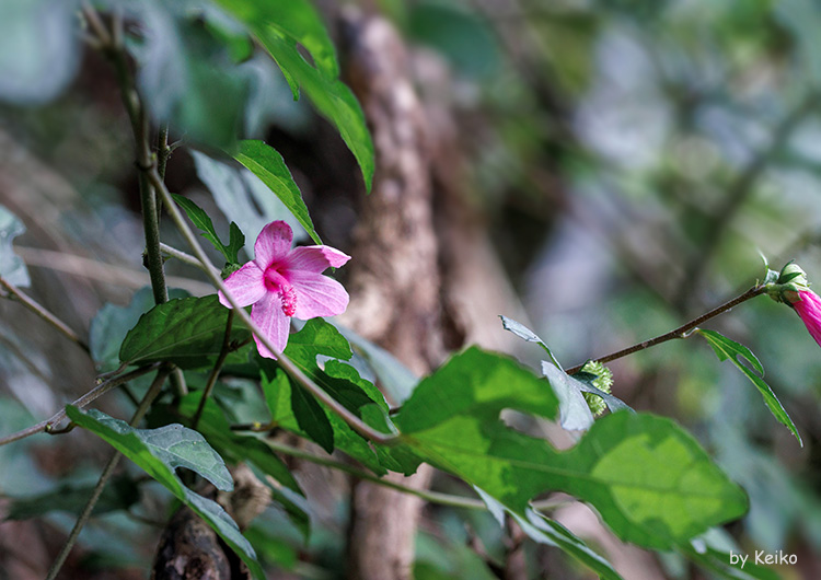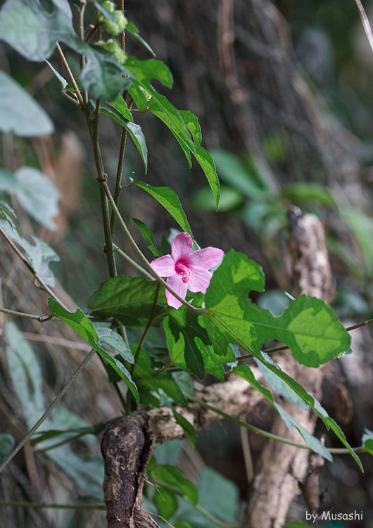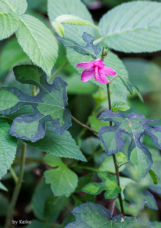 Urena lobata L. subsp. lobata との大きな違いは葉の形。ボンテンカのように深く深裂せず、浅く3~5裂した広卵形~円形。