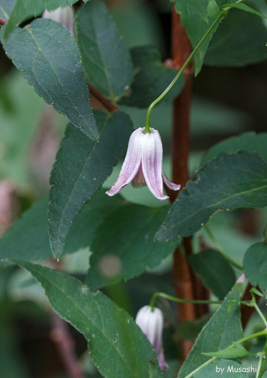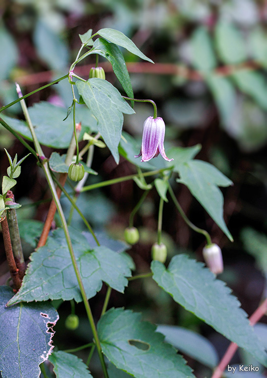 <類似種> ハンショウヅル : 花期は5~6月。花は暗紅紫色の鐘形で長さ2.5~3cm。 |