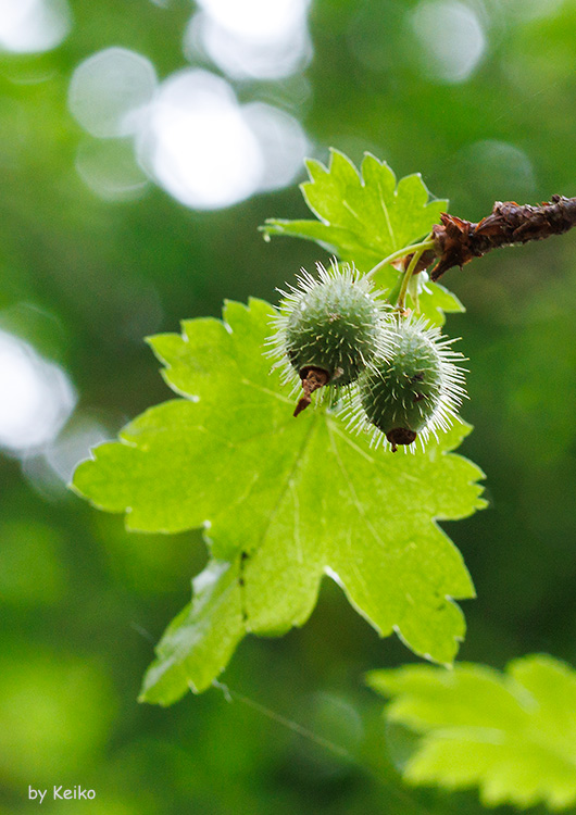 別名はテンバイ、テンノウメ。 根は落葉広葉樹の老木の樹幹上を這い、樹幹から垂れ下がり、時に1mになるものもある。葉は互生、短枝の先に束生する。葉は長さ3~4cmの円腎形で、両面に軟毛が多く、縁には鈍鋸歯があり、浅く5~7裂する。葉柄には軟毛が密生する。雌雄異株で、葉腋に1~3個の柄のある花をつける。花は短枝の先に1~2個ずつつき、淡緑白で長さ5~8mm。子房には針状腺毛が密生する。果実は直径7~12mm、球形の液果で、全面に針状の毛が生え、秋に緑色に熟す。和名は果実の形に基づくとされている。 |