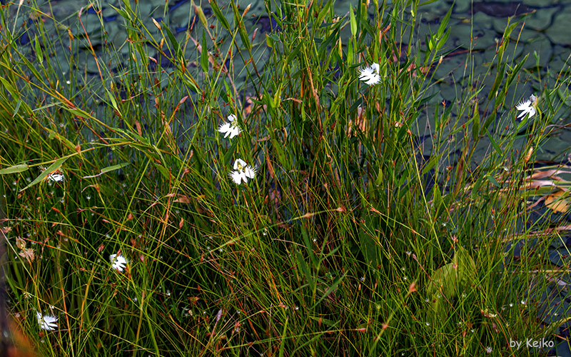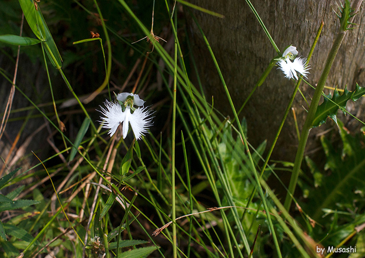 低地の日当たりのいい湿原。高さ15~40cm 葉は互生し、広線形、下部ほど大きく、基部は鞘状になって茎を抱く。花は1~4個つき、3cmくらい。萼片は緑色、側花弁と唇弁は白く、唇弁は3裂し、扇型に展開した側裂片の先が糸状に裂ける。距は長さ3~4cmで先端にかけて太くなり下垂する。