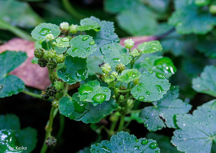 山林下の湿った土地。主茎は地をはい、無毛、斜上する枝に花序をつける。葉柄は無毛または反曲した短毛をまばらまたは一様につけ、主茎につく葉の葉柄は長さ6〜20cm、枝につく葉では長さ0.7〜4cmある。葉身は長さ2.5〜5cm、幅2〜6cm、脈状にまばらに短毛があり、基部は深い心形から広心形、掌状に浅く5〜6裂片に切れ込み、裂片の縁は鋸歯で鈍頭からやや鋭頭。多くは枝先の葉腋から1〜数個の花序を出し、花序柄は長さ3〜5mm、まれに主茎から葉対生で花序を出す。花は花序柄の先端に10個以上が球状に集まる。果実は平たい球形、長さ1〜1.2mm、無毛。 |