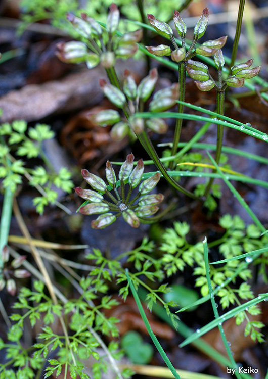 葉はセリバオウレンは2回3出葉ですが、↓コセリバオウレンは3回3出複葉で繊細。